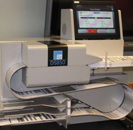 The DS850 is a high-speed, digital scan ballot tabulator designed for use by election officials at a central count facility. The DS850 can scan and count up to 300 ballots per minute. It uses digital cameras and imaging systems to read the front and back of each ballot, evaluate the result, and sort each ballot into the appropriate tray based on the result to maintain continuous scanning and tabulating.