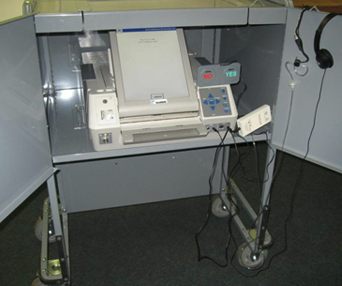 Visually impaired voters are provided headphones and braille touch pad keys on the right hand side of the screen to make selections. Voters who are not able to use the touch screen or touch pads are provided with a sip and puff tube to make selections. An instruction screen will appear and instructions will be read through the headphones. This is where voters may select a language other than English and adjust the text size and screen contrast.