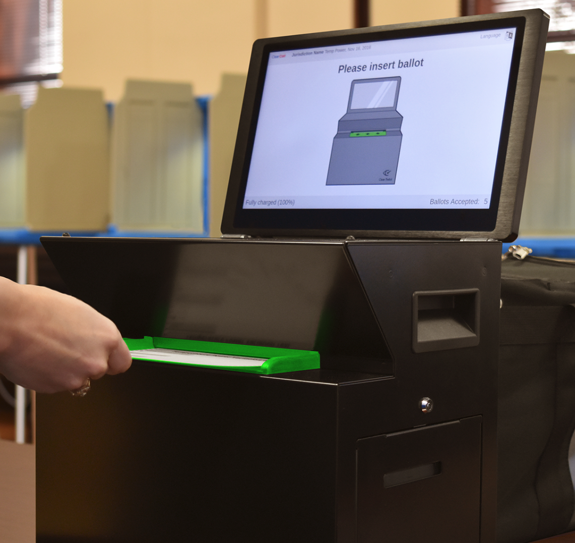 - Take your completed ballot to the ballot scanner and insert it into the scanner. A poll worker may be nearby to help you.