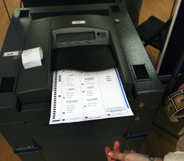 Some Optical Scan systems have trouble reading red inks or inks with red in them. Voters should use the writing instrument provided at the polling place or, if voting at home, black ballpoint pen that does not bleed through paper.