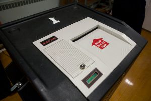 5. When done voting, take the ballot to the scanning machine and insert it in any orientation. If you have voted for more candidates for a race than can be elected (“over voted”), the machine may reject your ballot and will offer you the opportunity to correct your mistake. You may choose to submit your ballot as is, or correct the over-vote by marking a new ballot. (If you submit as is, your votes will be counted for all races except the over-voted race.) If the scanner is not working, your ballot will be secured to be scanned later.